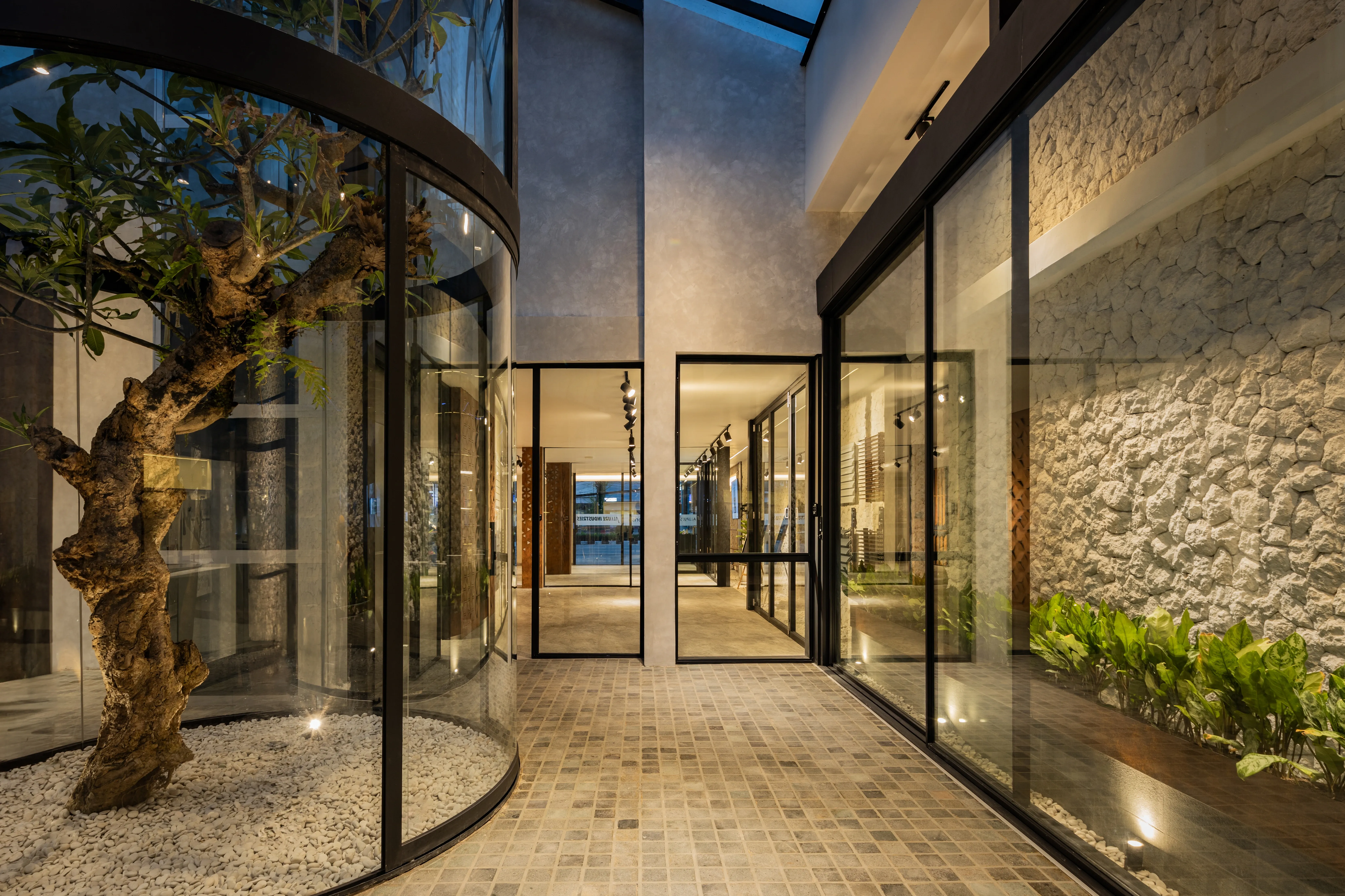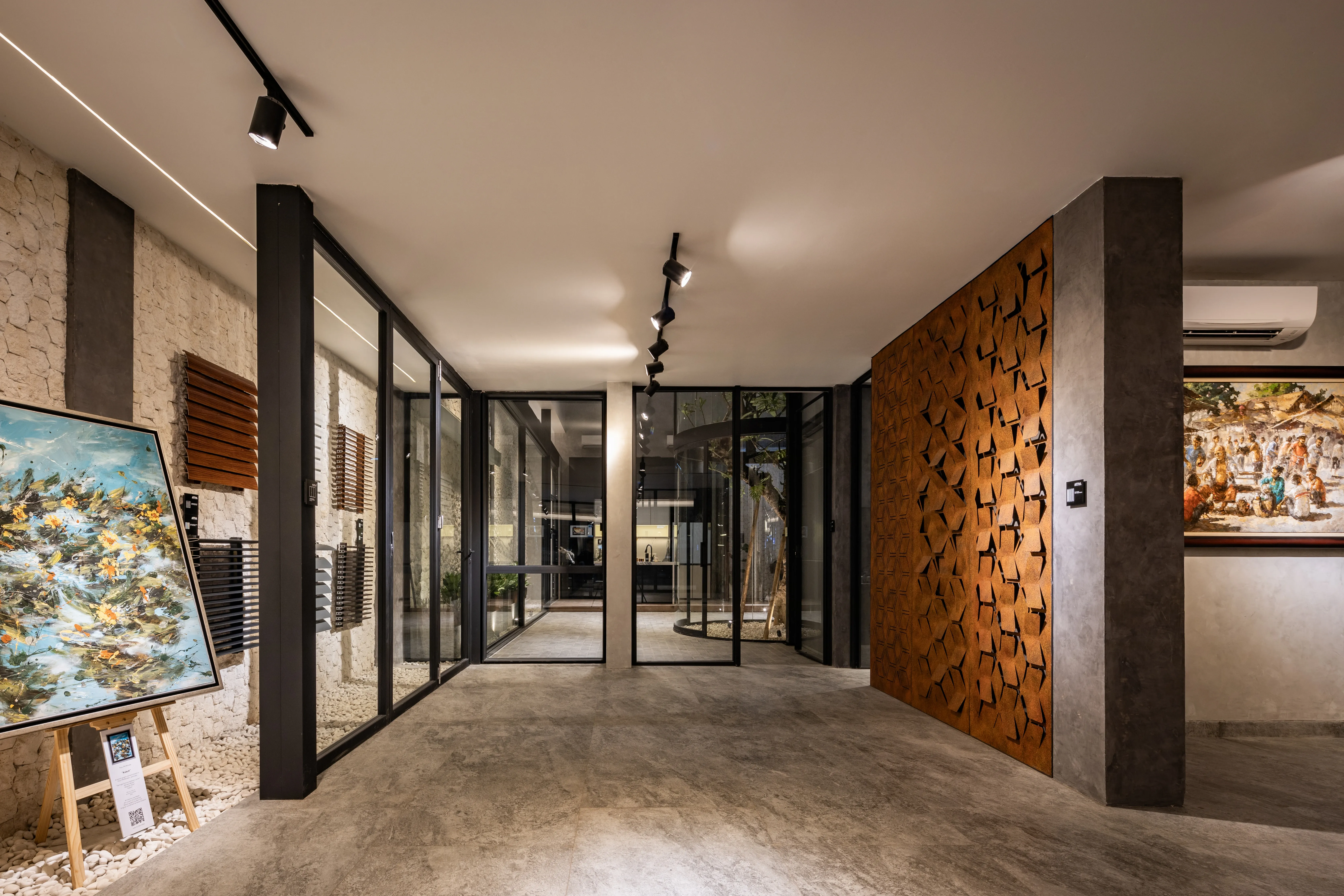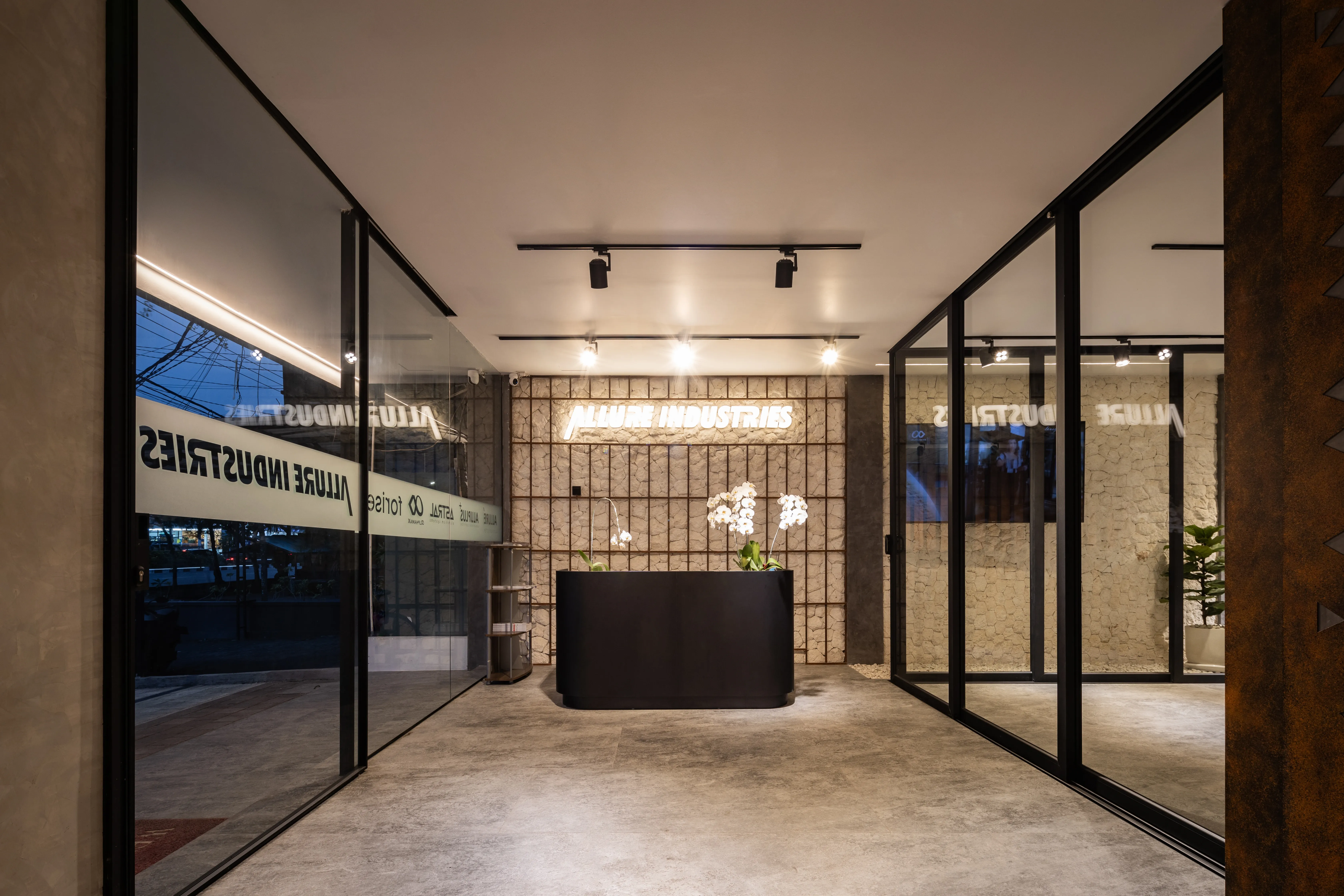 The Allure Industries Headquarters in Bali stands as an epitome of architectural innovation, encapsulating the essence of their aluminium expertise. At the heart of this design is a generative concept, conceived from the notion of an aluminium waterfall merged seamlessly with lush greenery, symbolising the harmonious union of technology and nature. The facade is a testament to this vision, resembling a cascading aluminium curtain juxtaposed with verdant vegetation, a homage to their aluminium profile production. This symbolic fusion is an aesthetic marvel and a representation of the company's ethos. The architectural challenge encompassed the integration of multifaceted technologies within a 4-story structure, aligning with the company's dedication to showcasing its advancements. Upon entering, guests are greeted by a spectacular glass roof and a sliding curve double high door, an architectural marvel inviting curiosity and setting the stage for the futuristic journey within. The rooftop astutely features an openable glass roof, offering a glimpse into the limitless potential and possibilities that lie within the intersection of technology, nature, and architectural mastery.