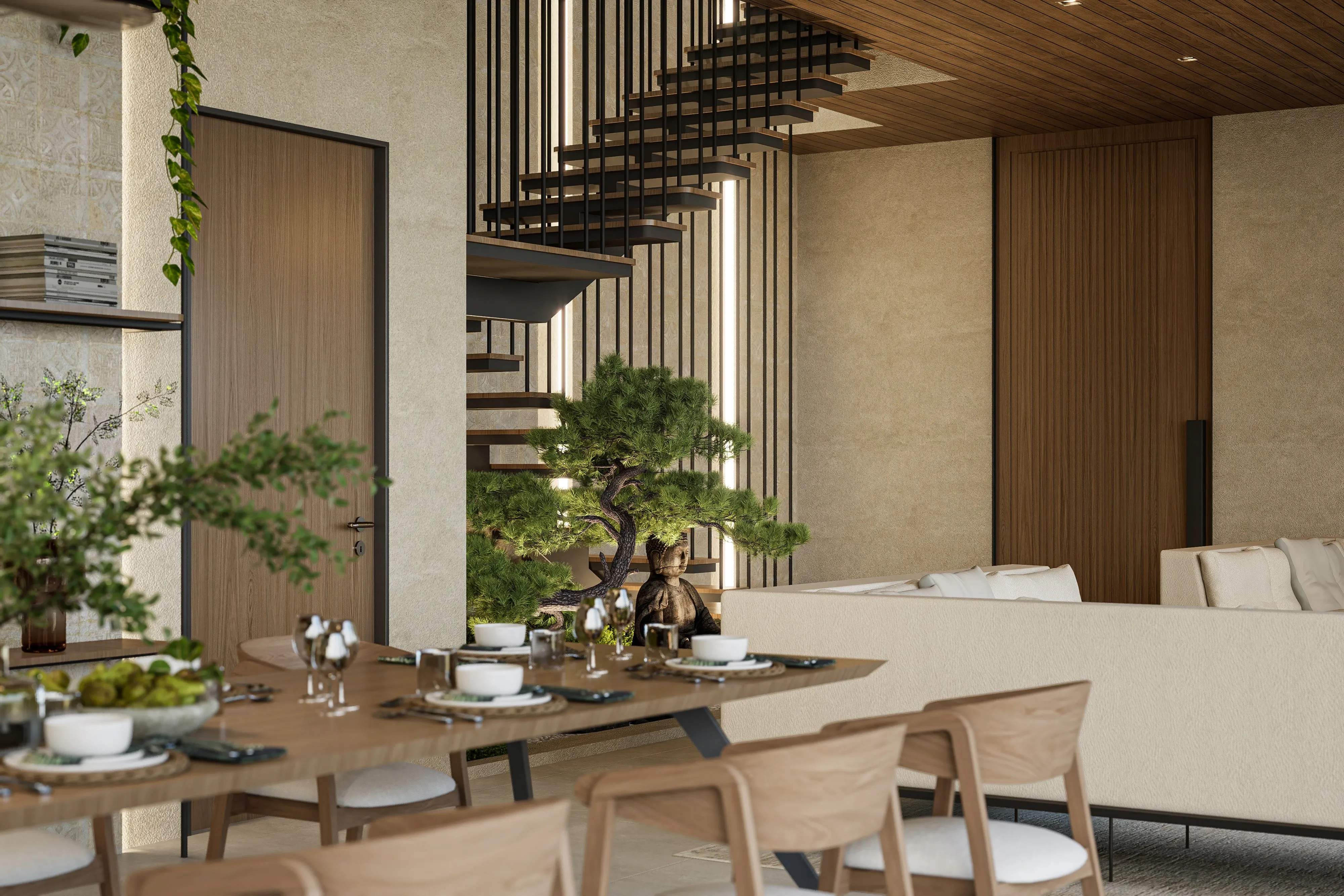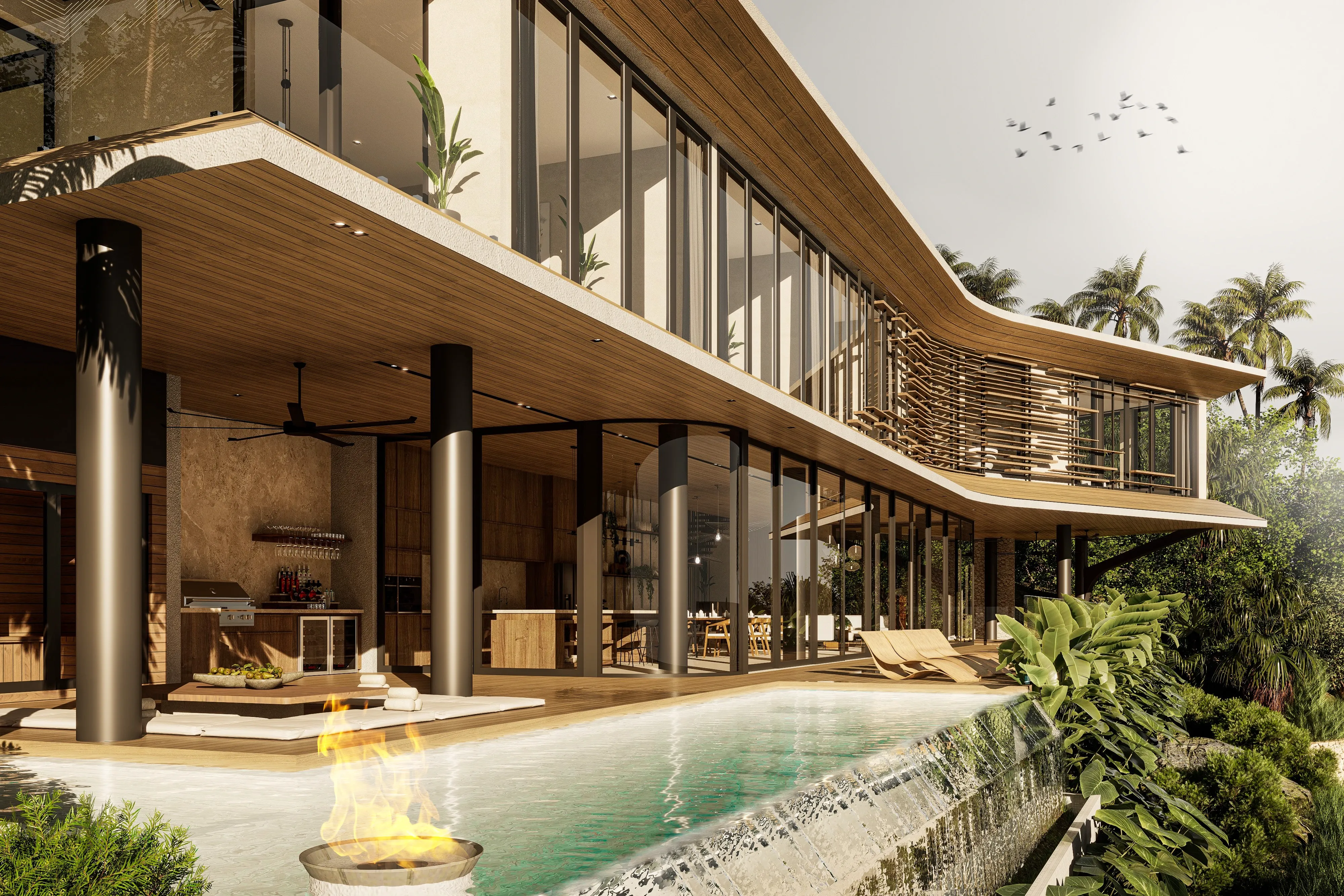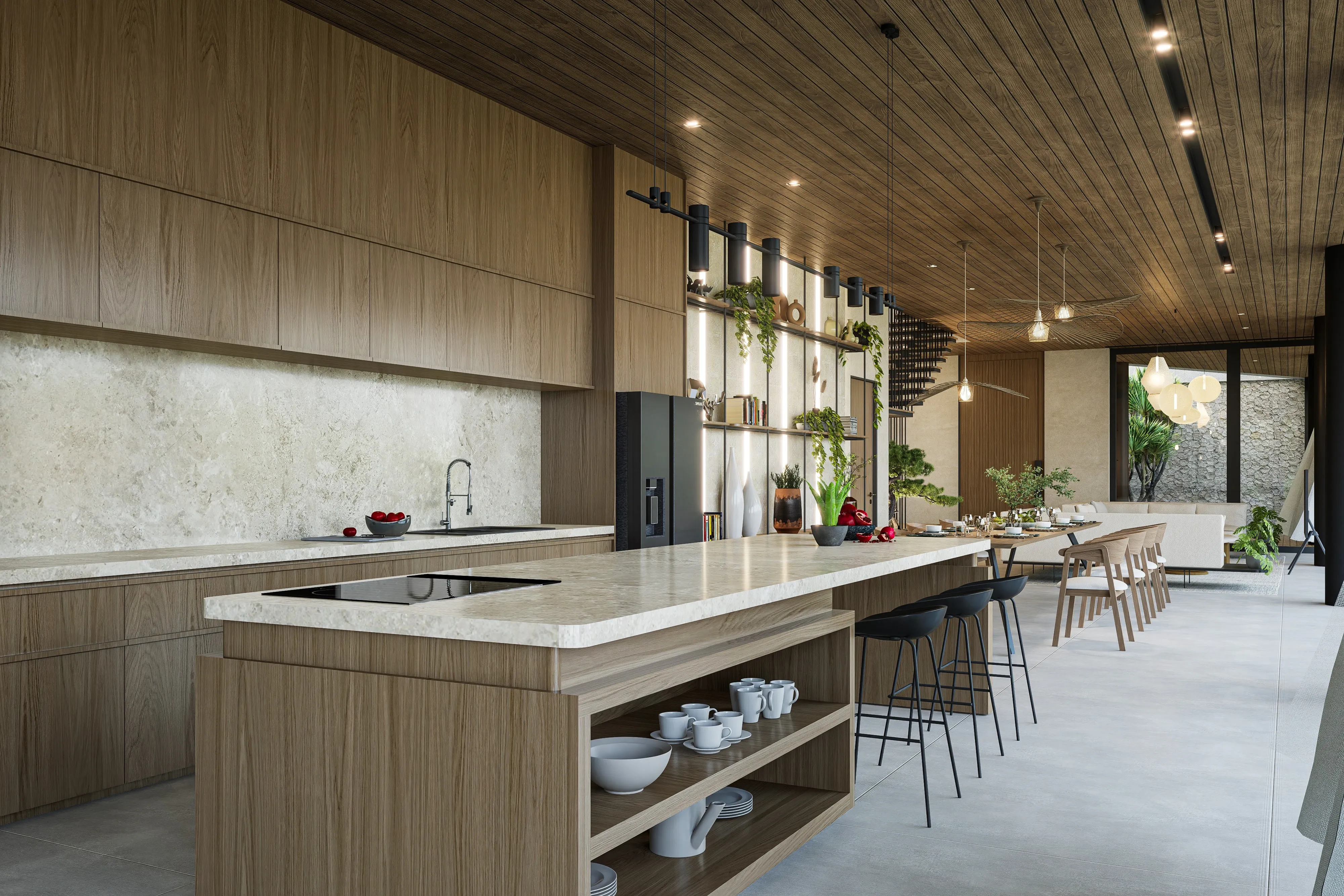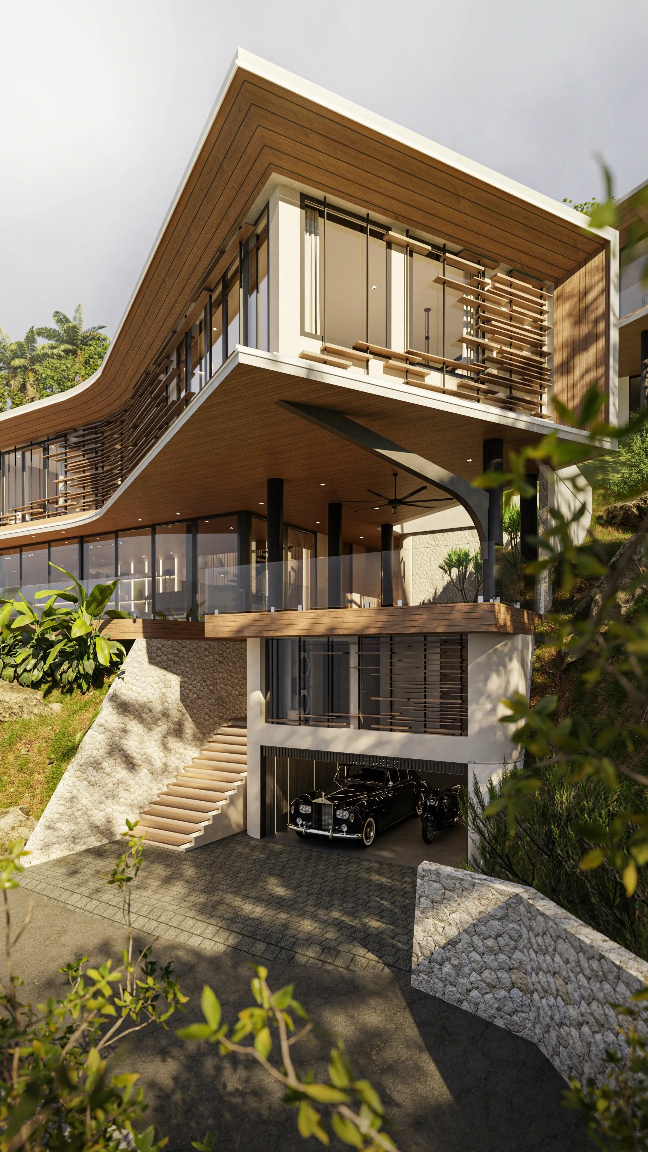 Villa M is an architectural gem spanning three stories, boasting a distinctive design approach that immediately captures attention. The villa is accessed from the lower part, affording a unique perspective of an astonishing cantilevered volume that extends across all three levels, housing the entrance. This dramatic architectural feature serves as a testament to structural innovation, as it seemingly defies gravity. The villa is not just about bold statements; it also thoughtfully integrates elements that enhance the living experience. A yoga deck, with awe-inspiring ocean views, invites tranquility and serenity. The living spaces are characterized by a seamless fusion of the interior and exterior, effortlessly blending the realms of indoor and outdoor living. Aesthetic harmony is achieved through the fusion of Indonesian materials and contemporary lines. This marriage of traditional and modern design elements is not just visually striking but also creates a rich tapestry of cultural and architectural influences, encapsulating the essence of Villa M's unique and inviting character.