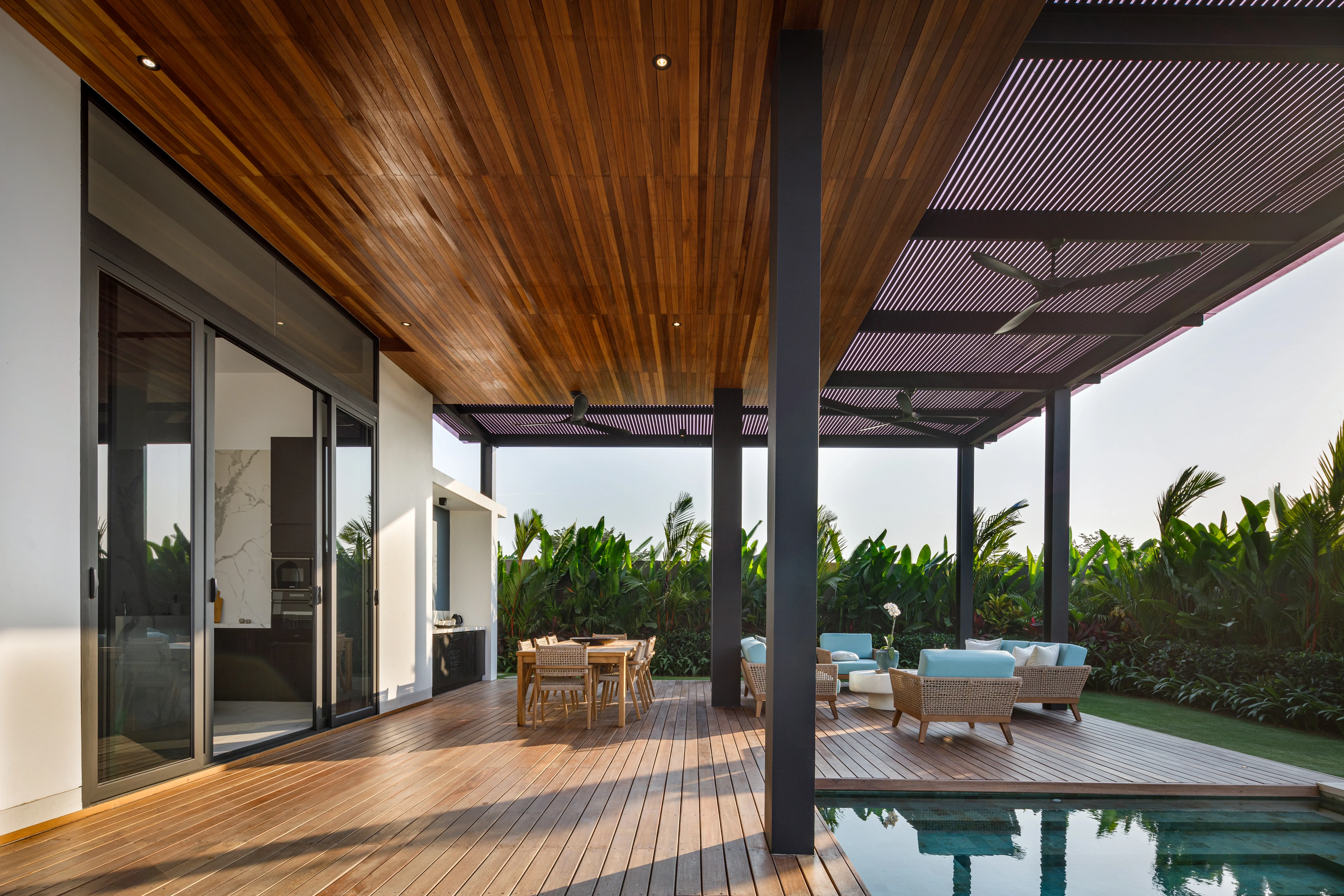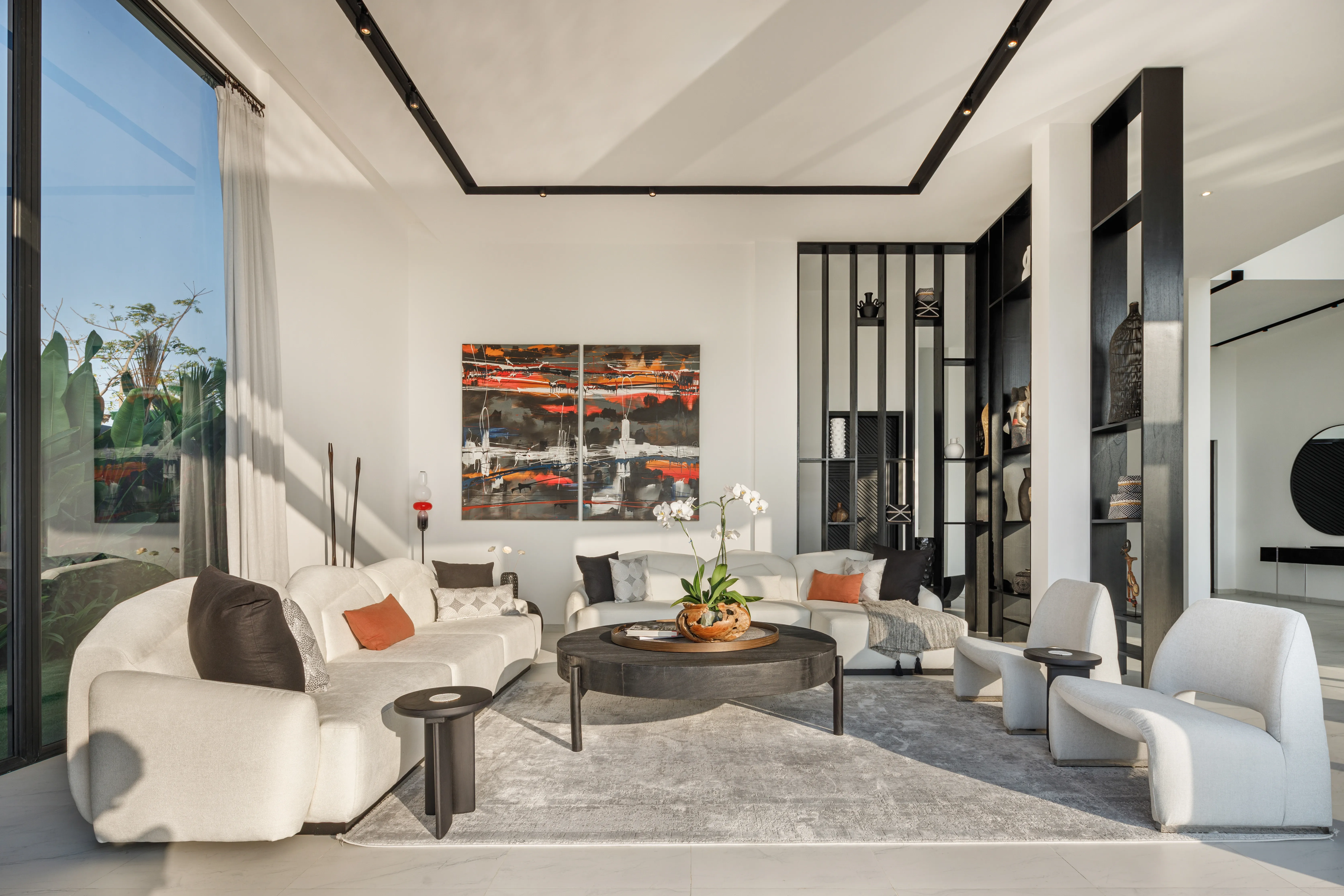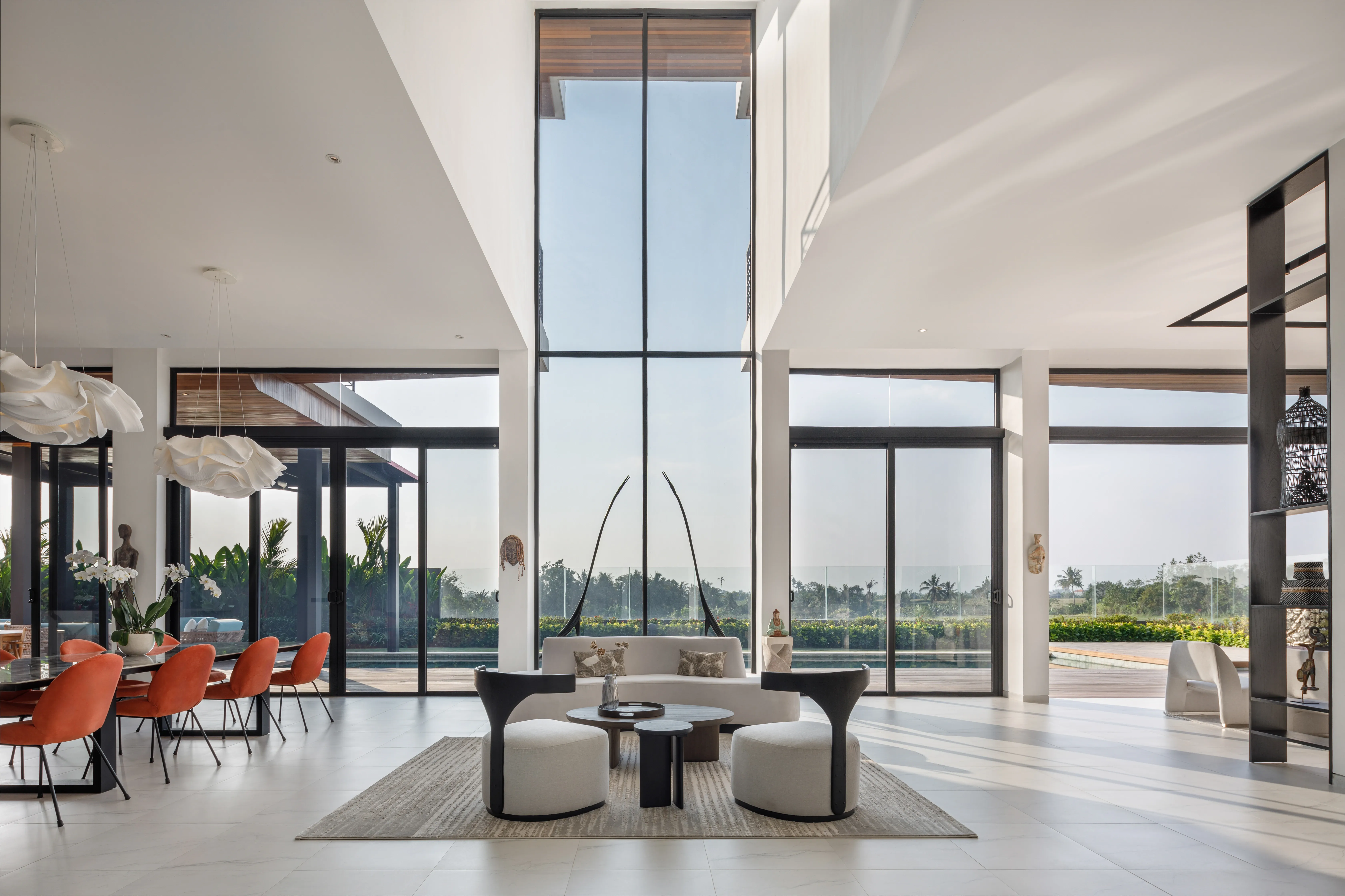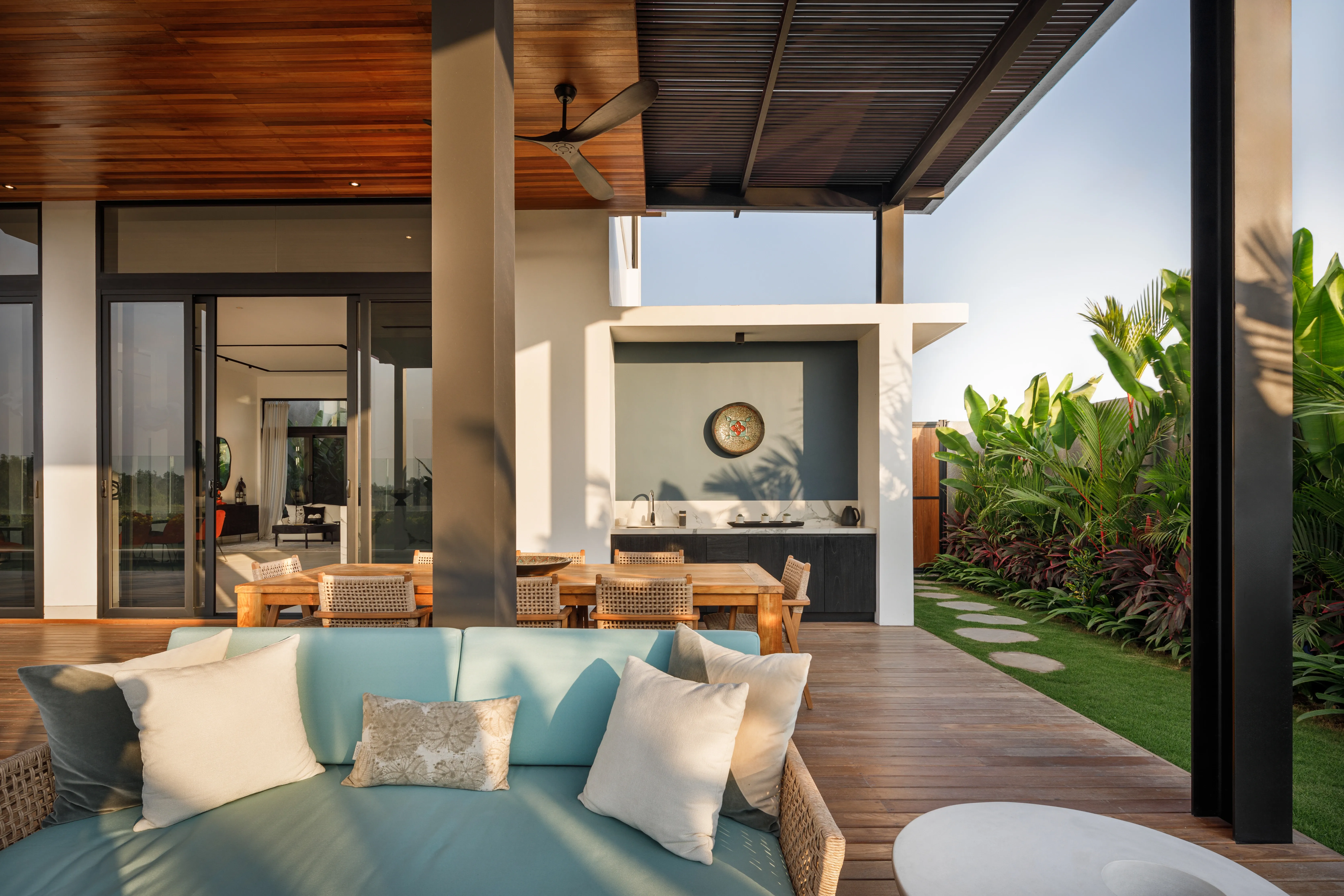 Villa Shaant, situated amidst the captivating rice fields of Pantai Nyani, embodies a fusion of architectural sophistication and tropical aesthetics. The design ethos harmoniously marries clean, modern lines with the rustic allure of tropical materials, offering an exquisite experience to its inhabitants. Upon entering, a grandeur double-height ceiling, reaching an impressive 7.5 meters, greets visitors, setting a tone of spaciousness and awe-inspiring design. The architectural vision places paramount importance on optimizing views from every room, allowing inhabitants to immerse themselves in the untouched beauty of the rice fields. This design philosophy masterfully balances pristine white hues with the deep, rich tones of locally sourced black wood, creating a captivating interplay of contrast and intricate geometry. Villa Shaant stands as an architectural masterpiece, an elegant testament to the symbiosis of contemporary design sensibilities and the enchanting essence of the surrounding natural landscape.