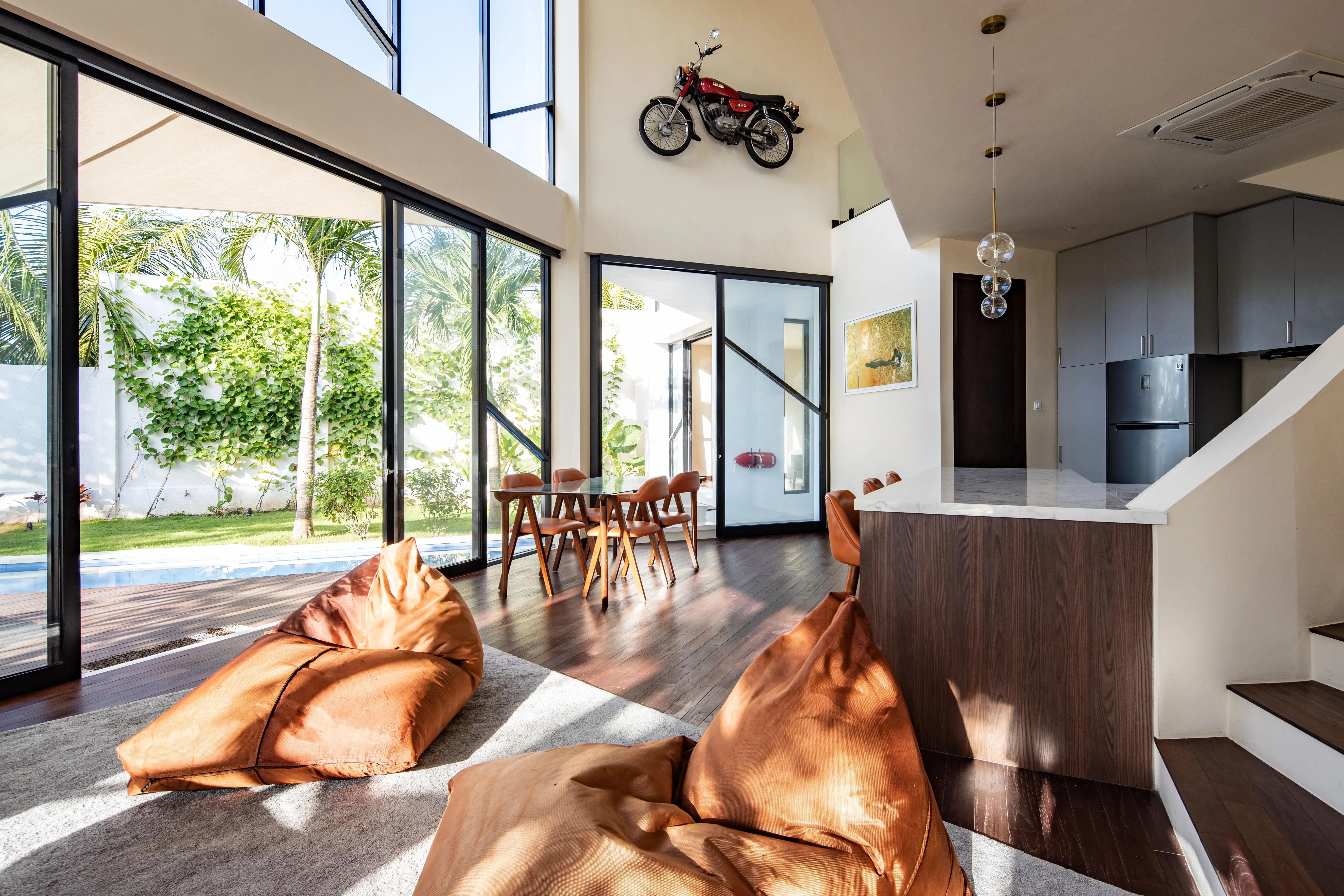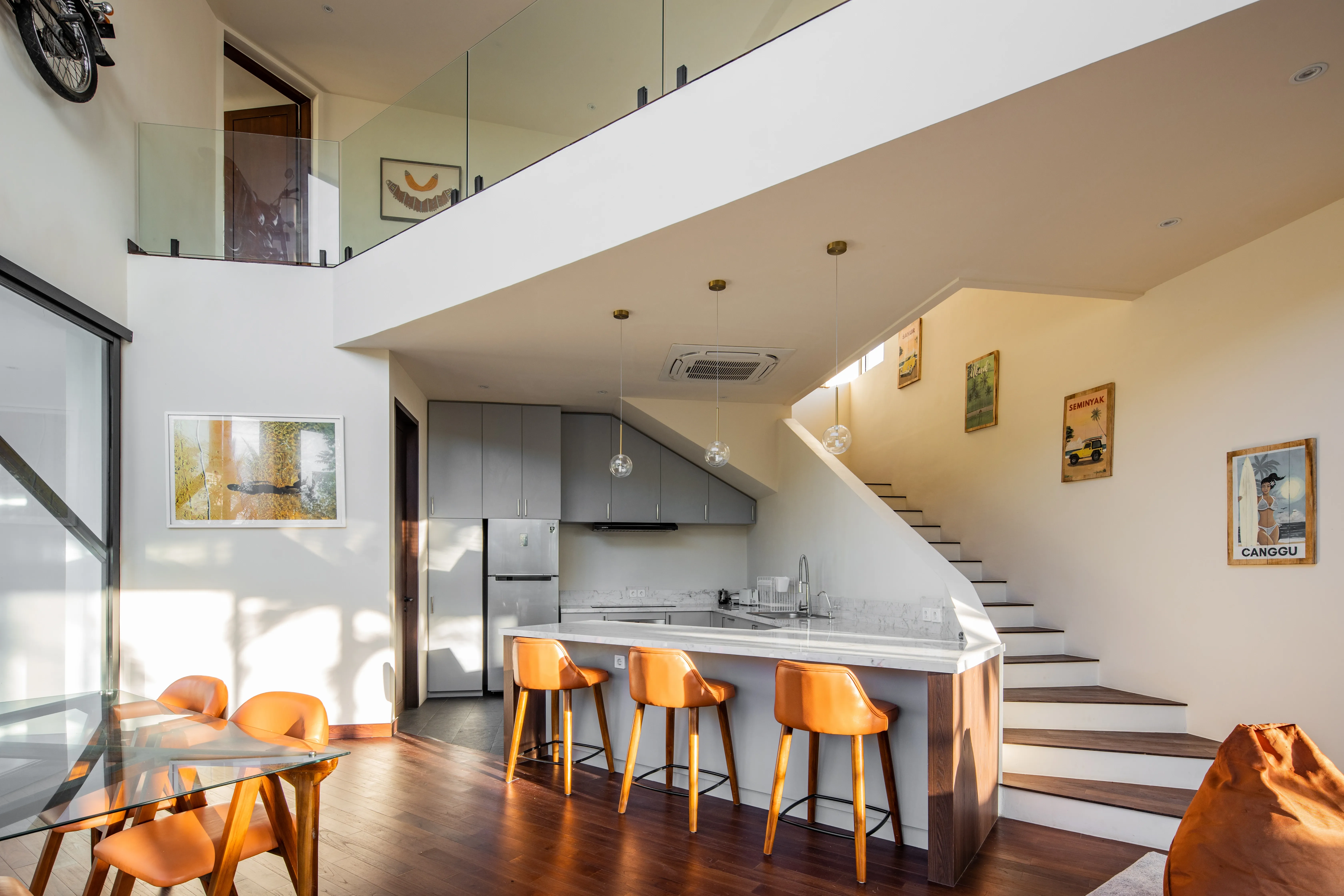 Slick, cozy and elegant, Villa Trevor is a definite tropical living space. The villa’s layout is designed to optimize the rice field view of its second floor; while the ground floor features a 25-meter lap pool that passes through the villa’s main compound. The double-high ceiling allows the natural light to enter and permeate the kitchen and relaxation area simultaneously. An additional loft unit attached to the main house can be rented separately to optimize the property’s investment value. The sharp design of the facade gives a fantastic reflection during sunset.